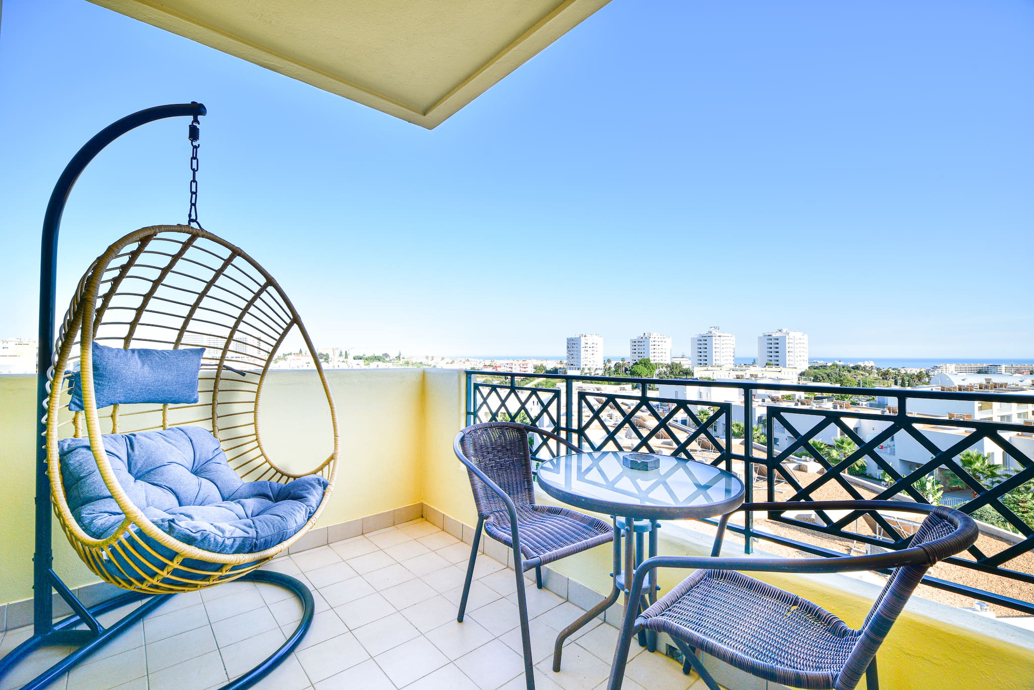 • Sunny south-facing balcony with panoramic city & ocean views, hanging chair, and bistro table.